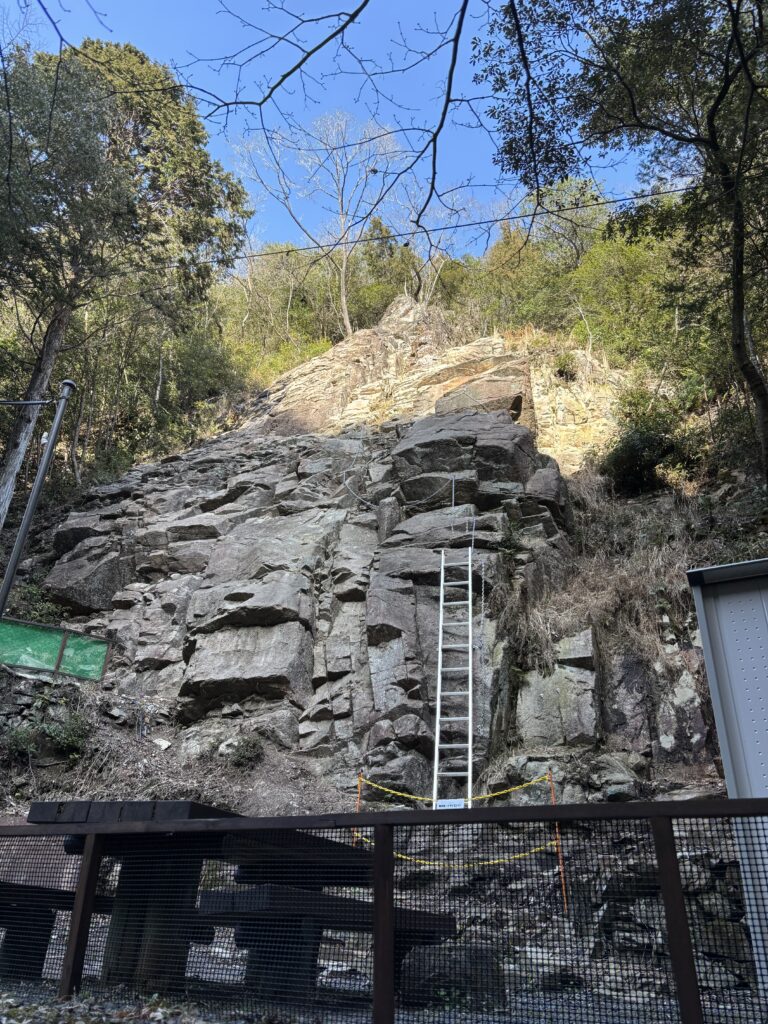 すぐにロッククライミングができる岩肌がある。とても危険そうな崖で、要予約と書いてある。